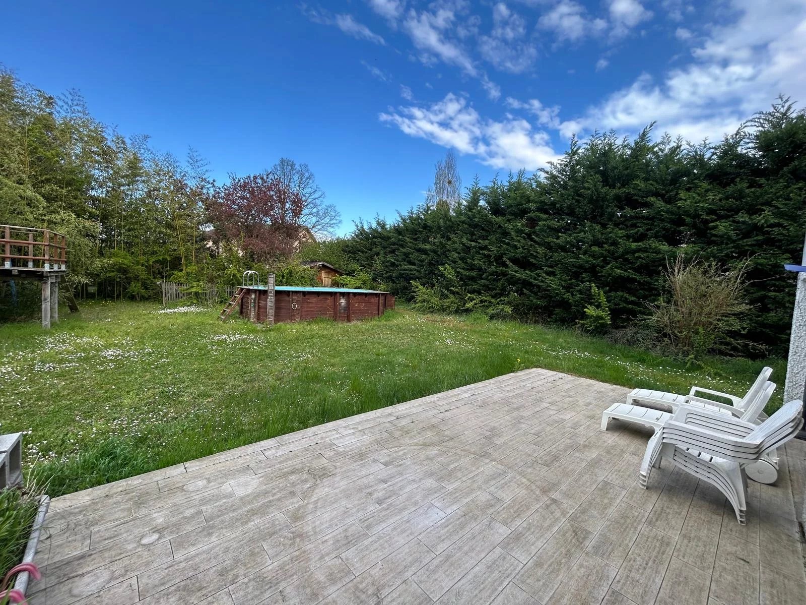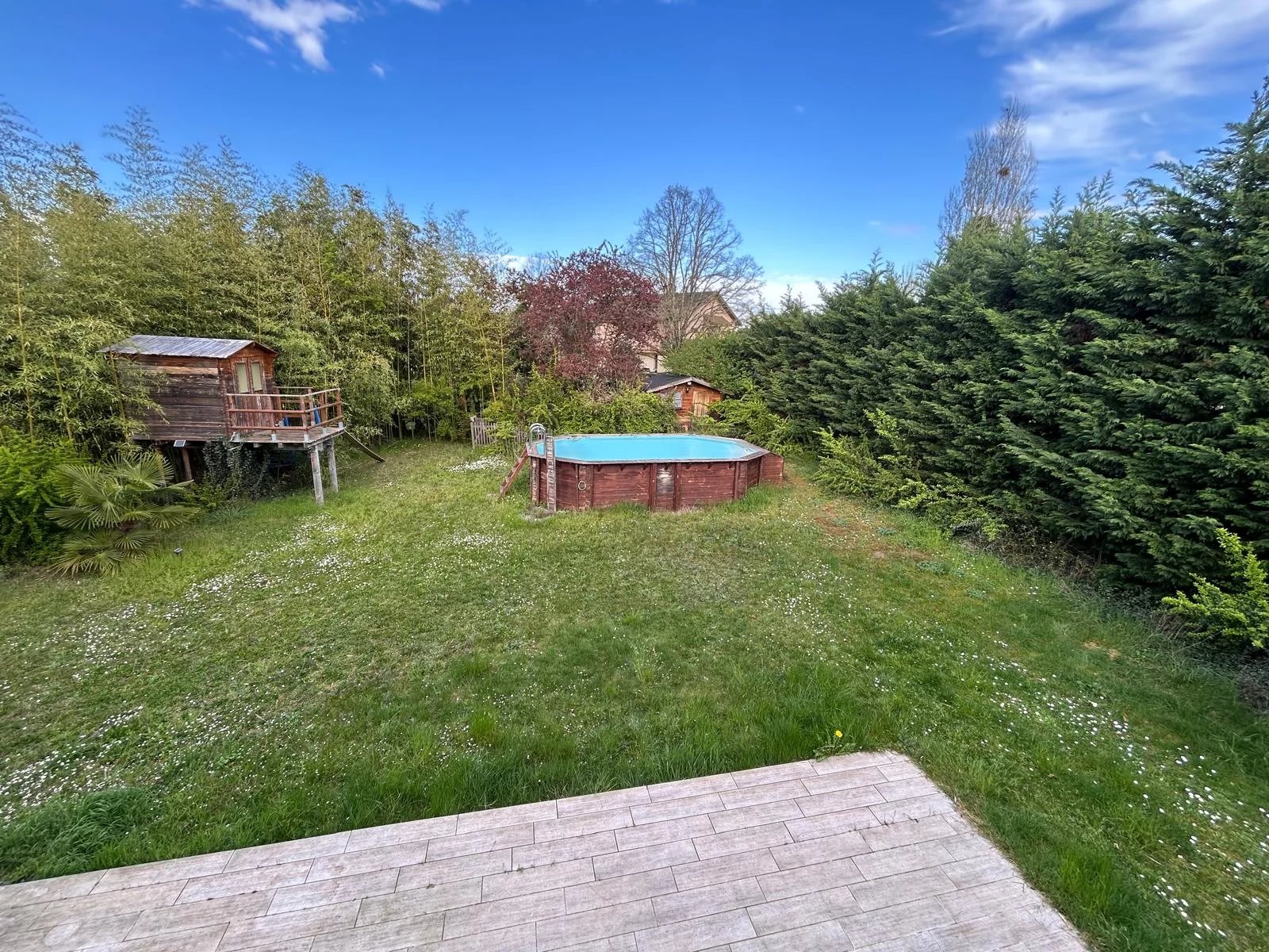 Un exterieur de 1050 m2 arboré avec terrasse . cabanon de jardin et piscine hors sol